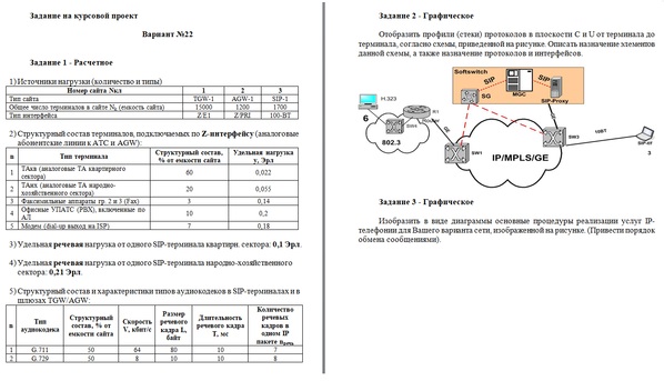 Содержание Задание на курсовой проект 4 Задание 1 - Расчетное 4 Задание 2 - Графическое 5 Задание 3 - Графическое 5 Введение 6 1. Обзорная часть 7 1.1 Архитектура NGN 7 1.1.1 Транспортный уровень 8 1.1.2 Уровень управления коммутацией и обслуживанием вызова 9 1.1.3 Уровень услуг и управления услугами 10 1.1.4 Концепция Triple Play 12 1.1.5 Услуги передачи данных 13 1.1.6 Голосовые услуги VoIP 15 1.1.7 Услуга IP-TV 17 1.2 Обзор технологий построения транспортных сетей 18 1.3 Сравнение АТМ и IP 18 1.3.1 АТМ – сеть коммутации ячеек, IP – сеть коммутации пакетов 18 1.3.2 АТМ – сеть с установлением соединения, IP - сеть без установлением соединения 19 1.3.3 Возможность передачи данных разных типов по одному соединению 19 1.3.4 Возможность масштабирования сети 19 1.3.5 Распространенность сети 19 1.3.6 Стоимость сети 20 1.4 Технологии сетей доступа 20 1.4.1 Технология xDSL 20 1.4.2 Технология ETTH 21 1.4.3 Технология xPON 22 1.5 Традиционные телефонные сети (TDM-телефония) 22 1.5.1 Технологии пакетной телефонии 23 1.5.2 Технология IP-телефонии на семейства протоколов H.323 23 1.5.3 Технология IP-телефонии на базе SIP протокола 24 1.5.4 Технология IP-телефонии на базе MGCP/H.248 25 1.5.5 Концепция Softswitch 25 2. Проектная часть 27 2.1 Разработка структурной схемы для обеспечения телефонных услуг на базе заданной технологии IP телефонии 27 2.2 Расчет интенсивностей телефонной нагрузки 27 2.2.1 Расчет возникающей местной нагрузки 27 2.2.2 Распределение нагрузки по направлениям 30 2.2.3 Распределение нагрузки к ЦОВ 30 2.2.4 Распределение нагрузки от dial-up абонентов к модемному пулу ISP (AISP) 30 2.2.5 Расчет нагрузки, замыкаемой внутри данного сетевого узла (внутристанционная) - Aвн и межстанционной нагрузки между сайтами 31 2.2.6 Расчет междугородней нагрузки 32 2.3 Расчет интенсивности сигнальной нагрузки 33 2.3.1 Расчет сигнальной нагрузки к SIP-серверу (протокол SIP) 33 2.3.2 Расчет пропускной способности сетевых интерфейсов для сигнальной нагрузки 34 2.4 Расчет пропускной способности для речевой нагрузки в точках концентрации трафика 35 2.4.1 Расчет коэффициента избыточности 35 2.4.2 Определение расчетной нагрузки для речевой услуги 38 2.4.3 Расчет пропускной способности сетевых интерфейсов для речевой нагрузки 38 2.5 Расчёт пропускной способности пакетных интерфейсов в точках концентрации 42 2.6 Выводы по расчетной части 43 3. Графическое задание 2 44 3.1 Схема прохождения трафика 44 3.2 Профили протоколов в плоскости C 44 3.3 Профили протоколов в плоскости U 45 3.4 Назначение и функции каждого устройства 45 3.5 Назначение и функции каждого протокола и интерфейса 46 4. Графическое задание 3 48 Заключение 49 Список использованных источников 50